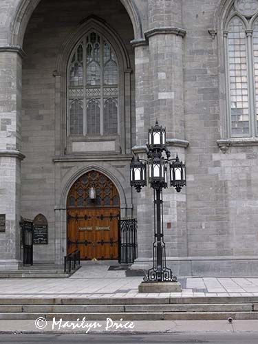 Lamppost and entrance to Basilique Notre Dame, Montreal