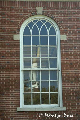 Window of Kingsport Utilities Building with reflection of First Baptist Church, Kingsport, TN
